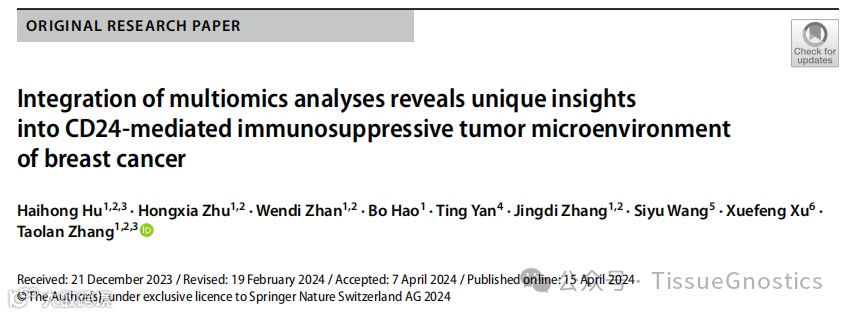 南华附一张陶蓝博士团队近期发表题为“Integration of multiomics analyses reveals unique insights into CD24‑mediated immunosuppressive tumor microenvironment of breast cancer”的文章。团队通过多组学技术,证明了乳腺癌中 CD24+ PANCK+ 和耗竭的 CD8+ T 细胞与 FOXP3+ 之间存在强烈的相互作用。此外,CD24+ PANCK+ 和 CD8+ FOXP3+ T 细胞与较低的存活率呈正相关。
