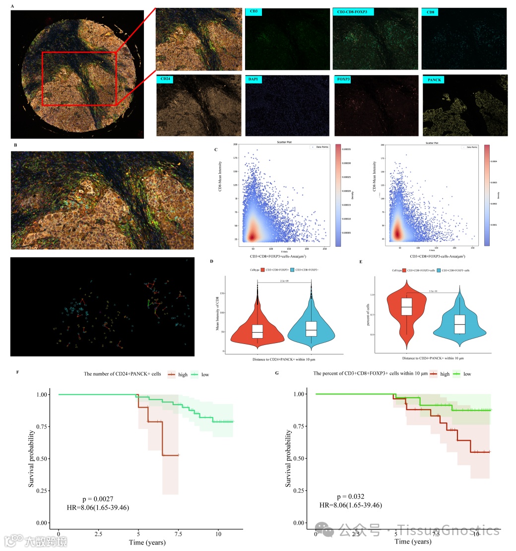 4.与临床生存率关联:分析了CD24+PANCK+细胞和CD3+CD8+FOXP3+T细胞对乳腺癌患者生存率的影响。