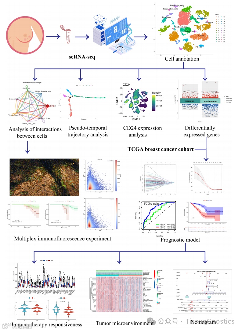 CD24是一种小糖基化细胞粘附蛋白,在乳腺癌、卵巢癌、非小细胞肺癌(NSCLC)、小细胞肺癌(SCLC)、肝癌、结直肠癌和肾细胞癌等实体瘤中表达,同时也在某些血液瘤中过表达,是一种在多种癌症中广泛研究的分子标志物。传统认为CD24是乳腺癌干细胞的公认标志物,有助于产生免疫抑制微环境。但最近的研究表明,在乳腺癌中过表达的CD24与其与巨噬细胞上的Siglec-10的相互作用有关,从而促进免疫逃避,进而形成免疫抑制微环境,这样迫切需要通过最新的研究技术来阐明,CD24或过表达是否介导乳腺癌免疫微环境的抑制性重塑。