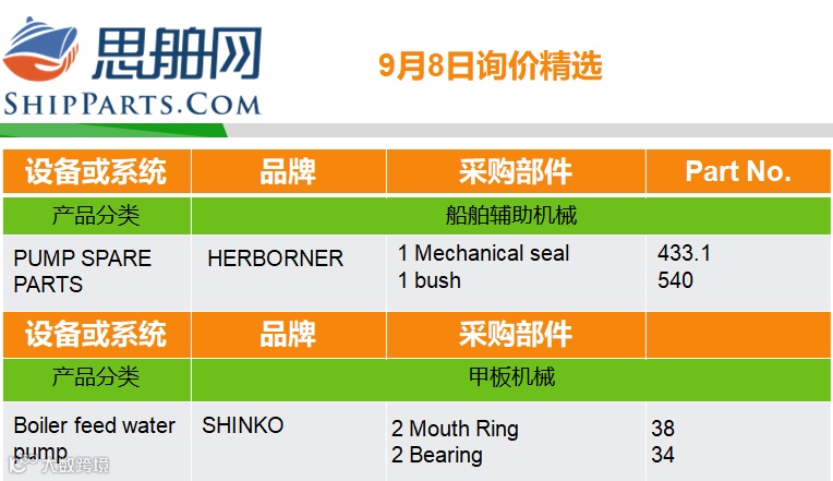 09-08询单精选 |登录ShipParts.com了解更多 思舶