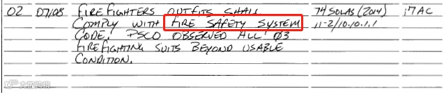 以上2条缺陷有个共性,PSCO都提到了接近式防火服,这种防火服是符合SOLAS公约对开放空间的要求的,但是如果进入有火的密闭空间,可能无法为穿戴者提供足够的热辐射防护。