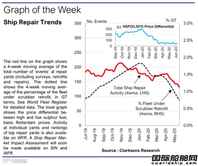 克拉克森在其最新发布的报告中称,今年以来脱硫装置的改装工作已经放缓,最初是由于新冠病毒疫情导致中国船厂无法正常运营。作为脱硫改装市场主力,去年中国船厂脱硫装置改装项目占全球76%,但今年年初在疫情影响下中国船厂复工延迟、劳动力供应中断。而现在虽然中国船厂已经全面复工,但高低硫燃料价格差大幅缩小,目前已经从每吨300美元急剧缩小至60美元,这对脱硫装置改装市场造成了很大冲击。