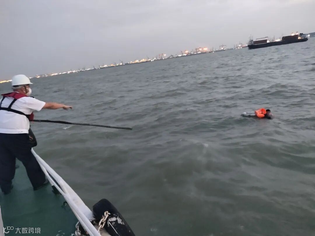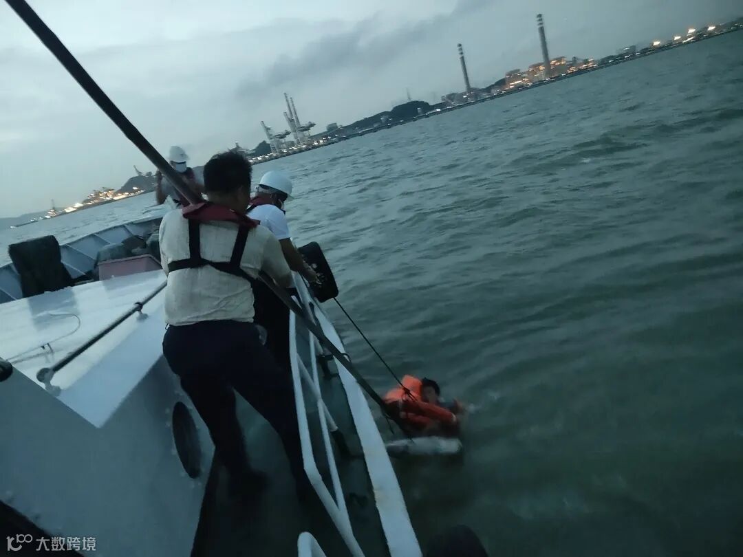 落水船员被成功救助到海巡船上