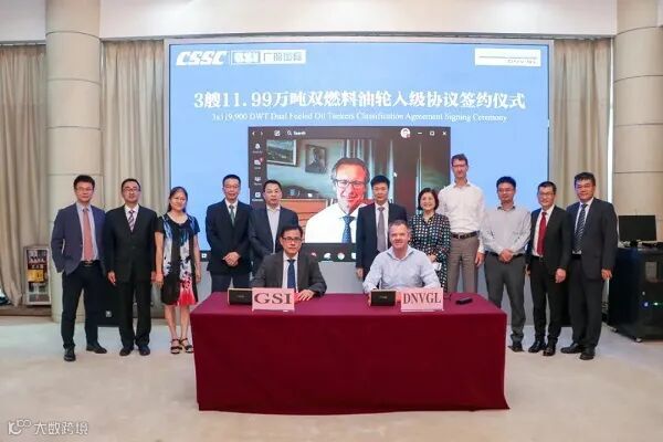 7月6日,挪威船级社(DNV GL)承接中国船舶集团广船国际3艘11.99万吨双燃料油轮检验合同签字仪式在广州南沙举行。DNV GL船级社首席执行官Knut Ørbeck-Nilssen采用实时视频连线方式见证了此次签约。