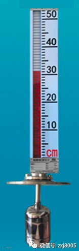 顶装磁翻板液位计是安装在容器顶部的一种安装方式,非常适合一些地下储罐,或侧面不方便开孔的容器,或所测液体介质粘度较大不易采用侧装的液位计等等。顶装磁翻板液位计一般分为上下两部分结构。上部分为液位计的主测量管,在管外捆绑有带磁性翻片的显示面板,用于指示液体的液位,这部分被安装在容器的顶部,通过法兰与容器的法兰连接,一般选配DN80或DN100法兰即可,法兰规格不宜小于DN80;下部分为导筒部分,为浮子的通道,导筒内浮子通过连杆与上部测量管内的磁性浮球连成一体,当液位出现上下变化时,浮子带动磁钢在导筒内上下移动,利用上浮子的磁耦合的作用驱动显示面板内的翻片翻转指示出液位。在浮筒外还可捆绑干簧管液位变送器以实现信号远距离传送和自动控制。