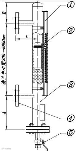 ①指示器;②磁浮子;③浮筒;④连接法兰;⑤排污阀