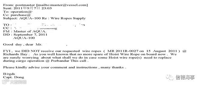 2011年,本人曾经在一条灵便船工作, 6月初在巴拿马上船跟船一直到6月29日在福建的罗源港接管船舶。在跟船期间,经仔细检查后发现克令吊钢丝绳状况不佳且仅仅有一套备用库存,因而接管后立即安排大副向公司申请在新加坡供应3套钢丝绳,后公司因费用等问题没有安排。船上随后持续申请在新加坡后的各个港口供应钢丝绳,但均没有供应上船。后船舶在南非装粮到墨西哥的VERACRUZ港卸货,结果因三个克令吊的吊货钢丝绳先后达到磨损极限而不得不停工而导致了时间及费用上的损失。