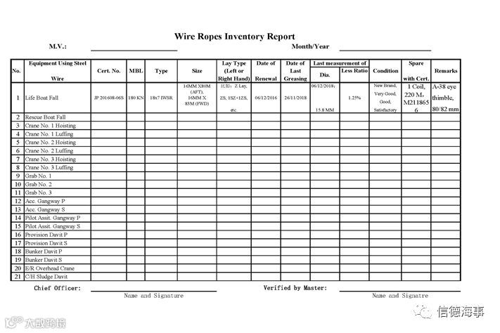 比如:根据以往的经验,钢丝绳的一般使用寿命为800小时,而某克令吊在离开某港后的总计使用时间已经760小时,则此时船舶应向管理公司报告并换新该吊的钢丝绳