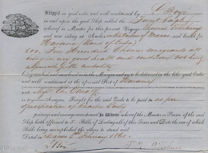 意大利热那亚律师Enrico Bensa(1848-1931)是位著作颇丰的经济史学者,他在整理史料时发现了大量中世纪票据,其中有保险单也有提单。1925年他发表了《早期的提单Le Forme Primitive della Polizza di Carico》一文,提及最早的两份提单签发于1300年代,而后来尤其是1500年代签发的提单较多。值得关注的是十六世纪正是所谓大航海时代,其促进货物流通的同时也虐助了大量非洲人被贩卖至美洲等地。笔者无意之间看到过一张美国锡斯波特Searsport博物馆收藏的提单,提单的装货港为澳门Macao、目的港为哈瓦那Habana、运费Freight for the said Goods to be paid as per Specification of Charter Party、签发人为Thomas Pittsbury船长、日期为1861年2月8日;令人震撼的或者震惊是提单中的cargo description:500 Five Hundreds Chinese emigrants all being very good health and condition not being responsible for the mortality.据记载,那个时期欧美因废止黑人奴隶造成劳动力短缺,有近15万华人被运往古巴充实甘蔗种植和制糖业,以至于林肯总统于次年1862年签署法令禁止美国船只从事运送华人做苦力。