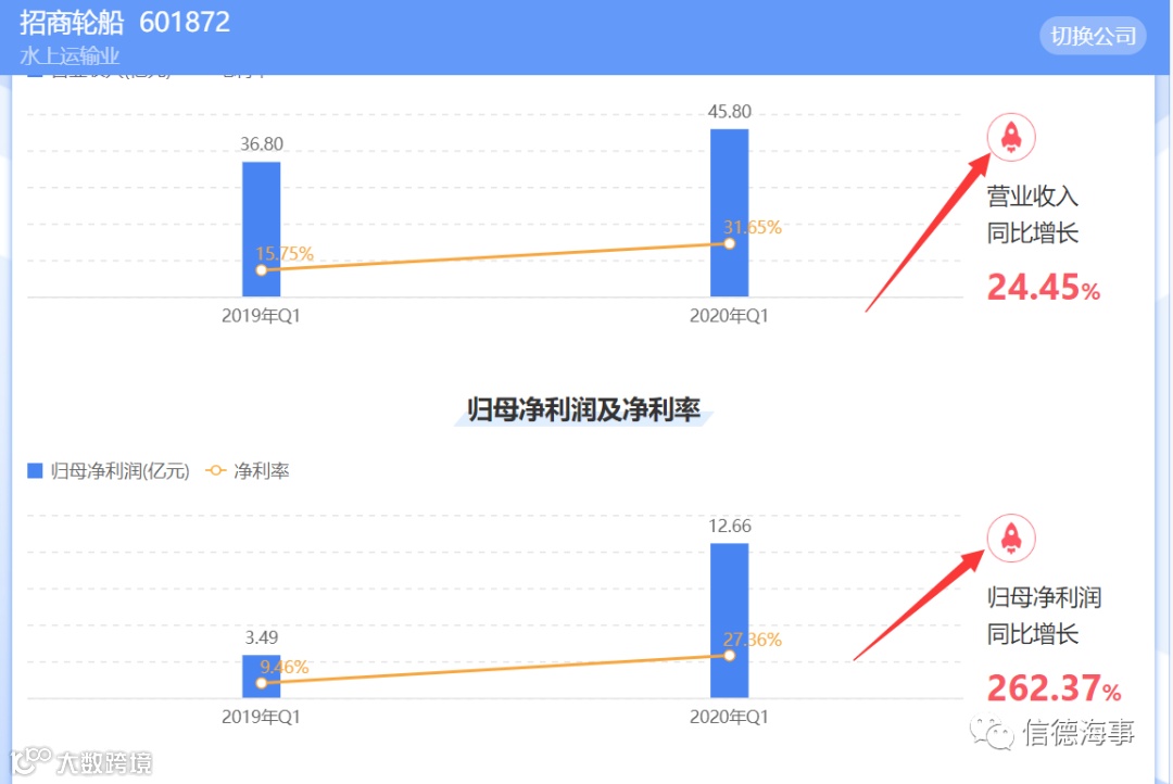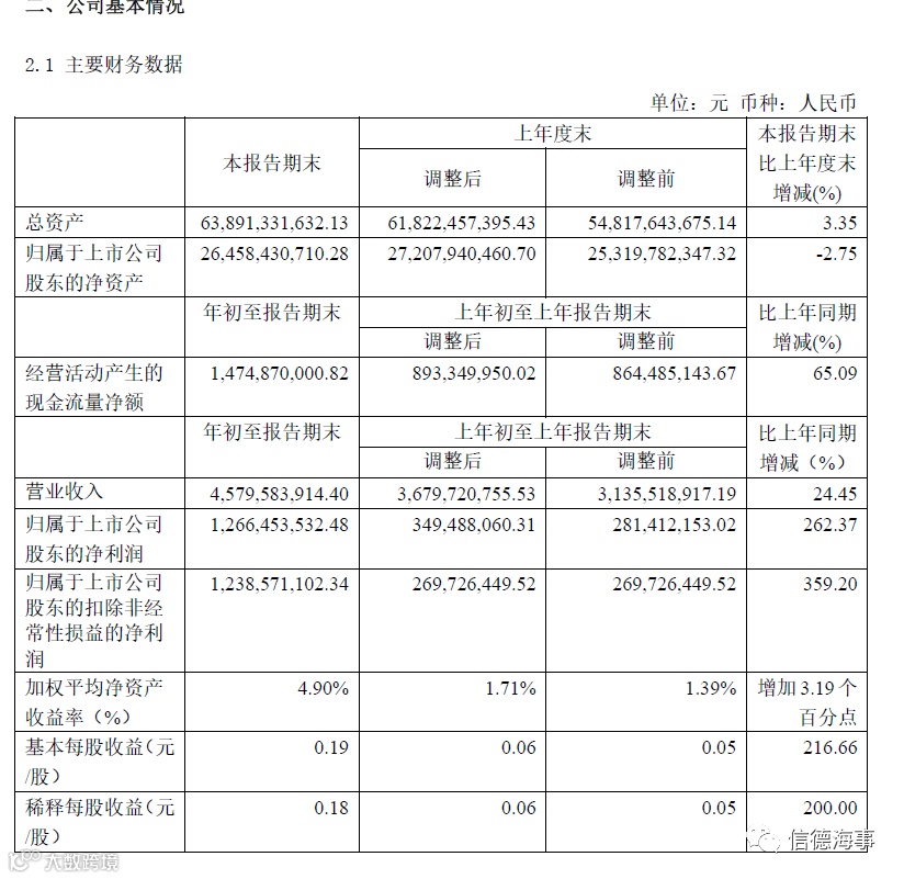 当天,招商轮船还发布了今年第一季度财务报告,报告期内该公司收入45.79亿元,同比增长24.45%,归母净利12.66亿元,同比增长262.4%,扣非净利12.38亿元,同比增长359.2%。