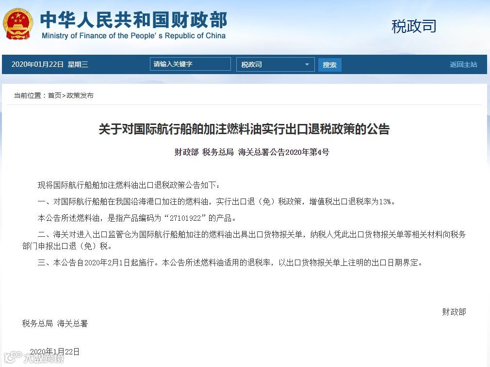三、本公告自2020年2月1日起施行。本公告所述燃料油适用的退税率,以出口货物报关单上注明的出口日期界定。