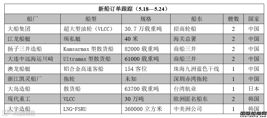 据国际船舶网跟踪:2020年5月18日至2020年5月24日,全球船厂共接获14艘新船订单;其中,中国船厂获得10艘新船订单;日本船厂获得1艘新船订单;韩国船厂获得3艘新船订单。