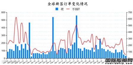 根据克拉克森最新数据统计(截至2020年3月15日),2020年2月份全球新签订单31艘,共计576428CGT。与2020年1月份全球新签订单49艘,共计954127CGT相比较,数量环比下跌18艘,修正总吨环比下跌39.59%。与2019年2月份全球新签订单130艘,共计2125576CGT相比较,数量同比减少99艘,修正总吨同比下跌72.88%。