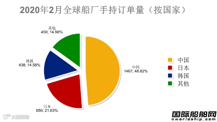 其中中国船厂手持订单量为1467艘,共计26813142CGT,艘数占全球市场份额的48.82%,CGT占35.43%;日本船厂的手持订单量为650艘,共计10822964CGT,艘数占全球市场份额的21.63%,CGT占14.30%;韩国船厂的手持订单量为438艘,共计20976097CGT,艘数占全球市场份额的14.58%,CGT占27.72%。