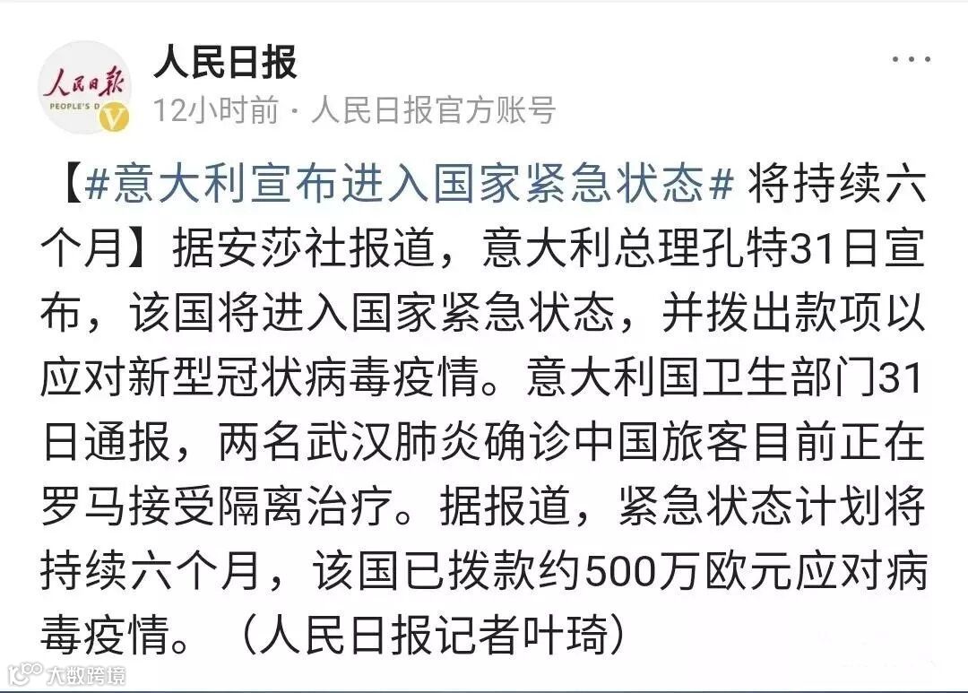 据人民日报最新消息,由于发现两名中国旅客的确诊案例,意大利宣布该国进行为期6个月的“国家紧急状态”!而在此之前,意大利政府已宣布停飞外来于中国的航班,这不仅对旅行人流,对于航空货运,也将带来严重影响!