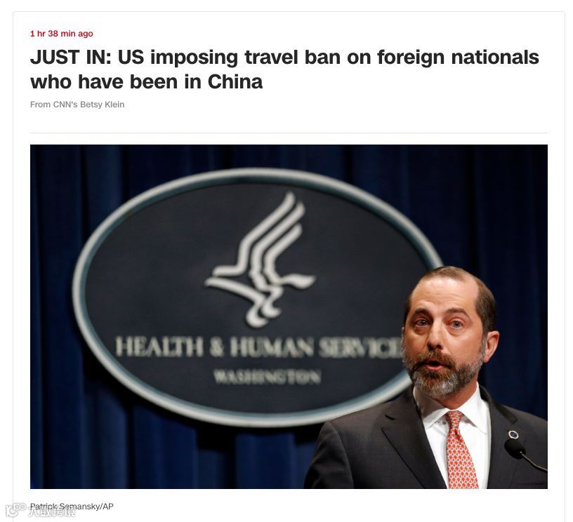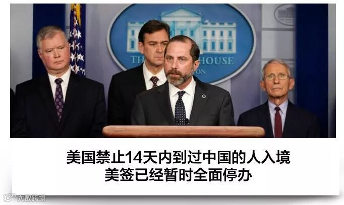 美国卫生与公众服务部部长阿莱克斯·阿扎(AlexAzar)宣布此次冠状病毒爆发为公共卫生紧急状态,他表示,总统已经对过去14天内抵达中国的外国人实施了临时入境禁令。禁止过去14天内到过中国的外国人进入美国。