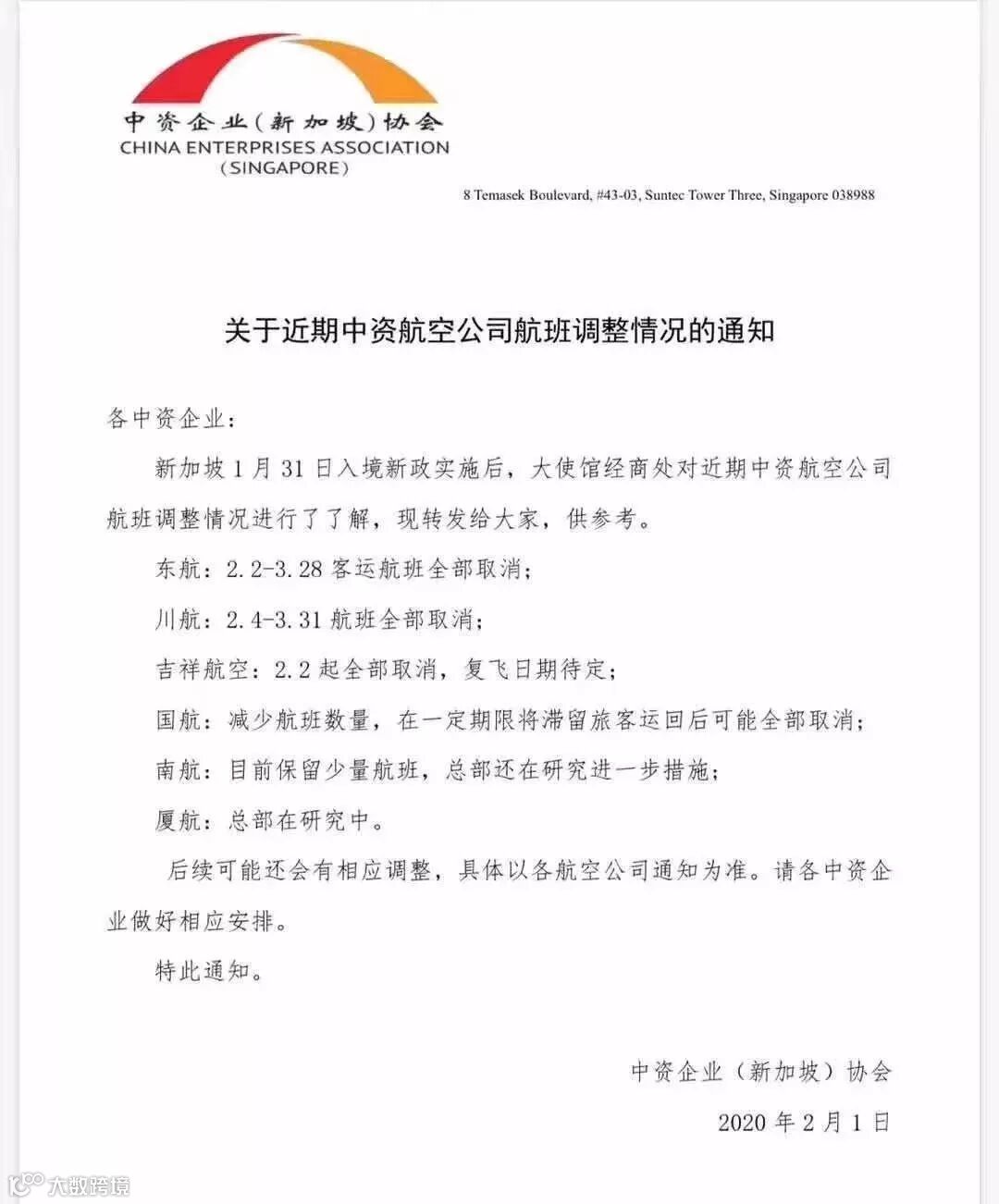 厦航:新加坡厦门/新加坡福州,只执行到2月3号。之后航班全部取消到2月29号。
