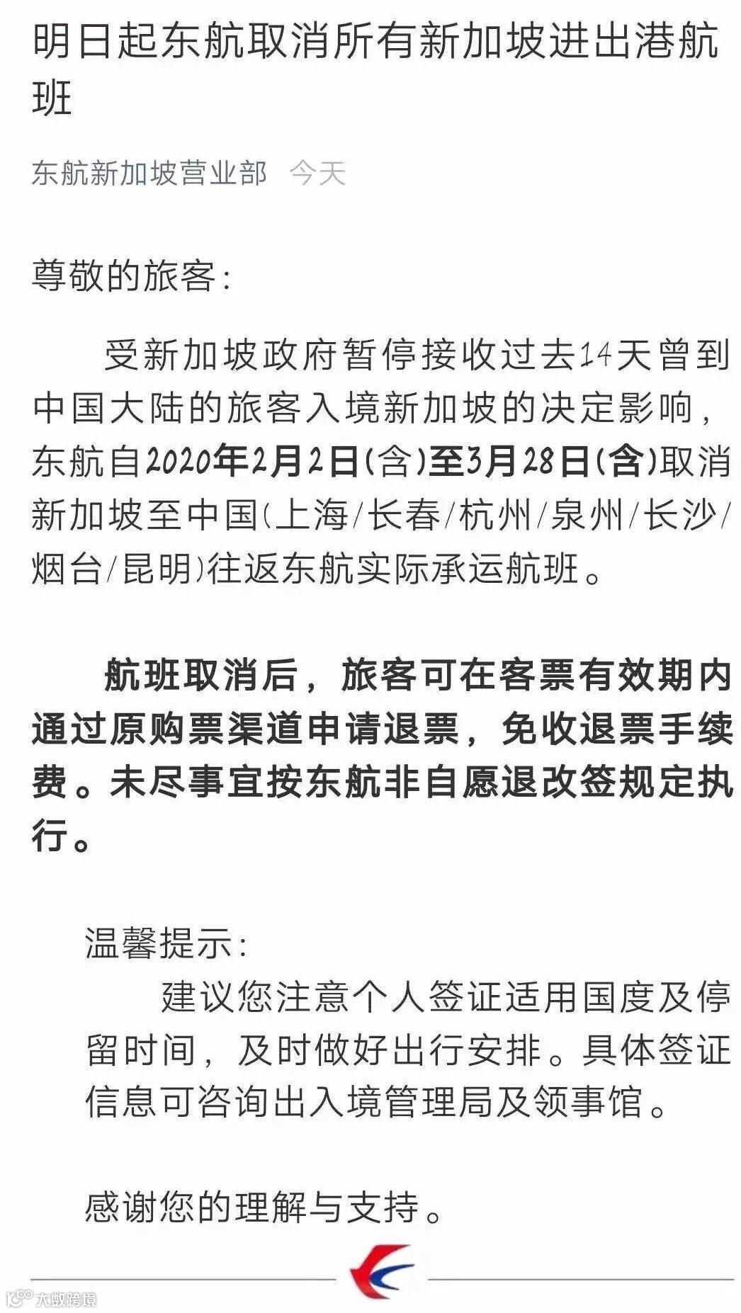 东航:2月2日-3月28日,所有新加坡航线取消(上海/长春/杭州/泉州/长沙/烟台/昆明);