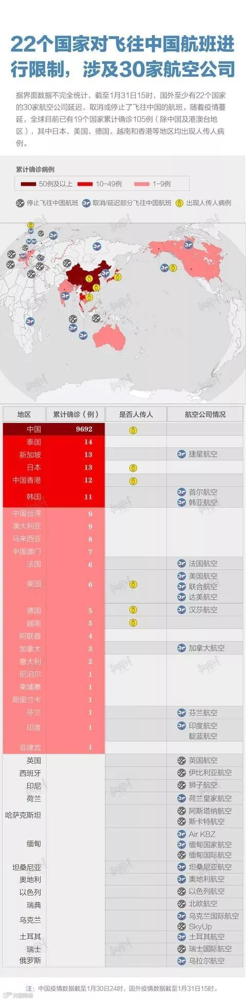 目前已有近22个国家,超过30家航空公司对往返于中国的航班进行了限制: