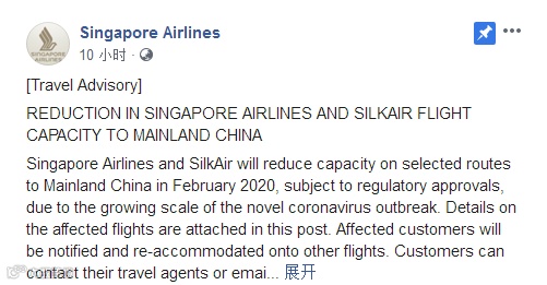 新加坡航空官方脸书也于今日公告,新加坡航空公司和胜安航空(SilkAir)如获监管部门批准,将在2020年2月减少部分飞往中国大陆的航线的运力。