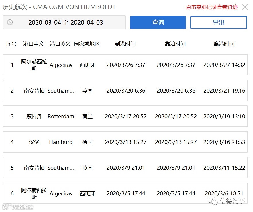 根据船讯网为信德海事网提供的CMA CGM Alexander Humboldt(PS:这名字太长了吧,救生圈的名字咋刻?)轮的轨迹以及航次信息显示,该轮3月26日从西班牙阿尔赫西拉斯出发,目前正航行于靠近西非的海域。