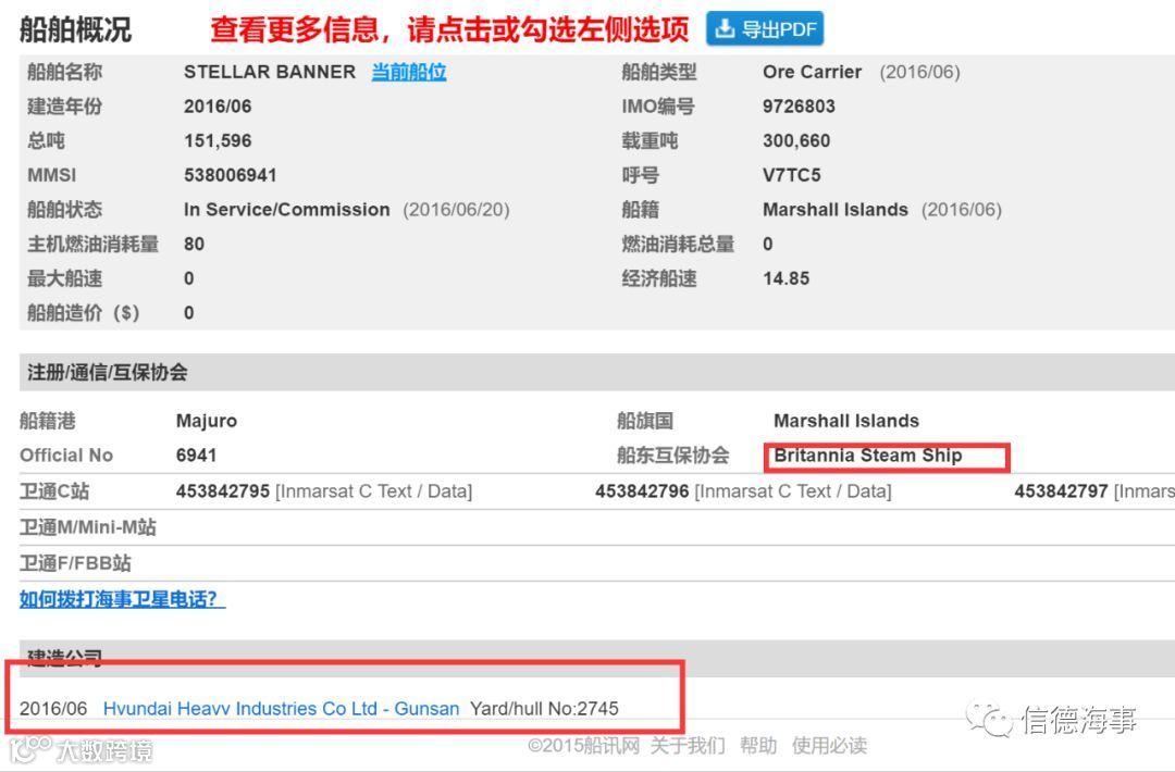 同样根据船讯网为信德海事网提供的该轮资料显示,这艘这艘300660dwt的巨型货船为韩国现代重工建造,归属Britannia P&I互保协会,韩国KR船级社。