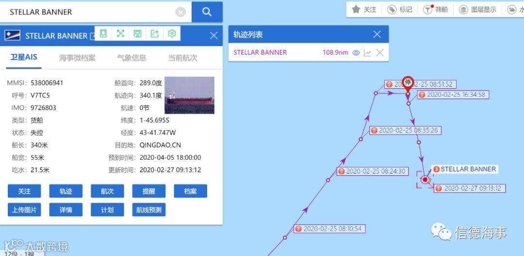 该轮在25日离港后不久就像发出了货舱进水紧急求救信息。根据船讯网为信德海事网提供的该轮的卫星AIS轨迹信息显示,该轮于(船讯网显示北京时间)2月25日0213从巴西Ponta da Madeira离港前往青岛,0850前后轨迹出现异常,截至发稿前北京时间2月27日0913,该轮仍停留在据事故发生时不远的海面上。