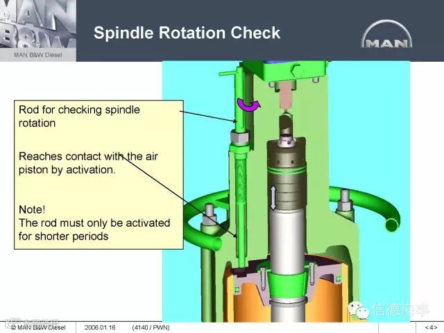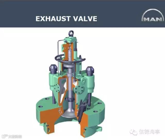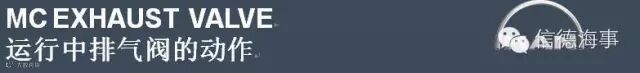 •合上阀位指示器,检查主机在正常运行时排气阀的 启闭状况,这时指示器的杆与下部的空气活塞接触,很容易可以看出阀的启闭状态。主机在运转时排气阀也会作相应的转动,在排气阀的空气活塞上开有一凹槽,凹槽的深度为6mn。排气阀杆每转动一圈该凹槽便经过阀位指示器一次,因此可以从阀位指示器位置的高低上观察出排气阀是否旋转。排气阀的旋转速度与主机的转速及负荷有关,负荷及转速越高,排气阀的旋转速度也越快,一般情况下其旋转速度在0.5~5.0转/分左右。