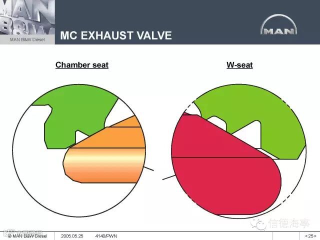 排气阀阀座密封面由内外两个密封面和中间一个环形空 间构成中间环形凹槽组成。在工作中凹槽至少有以下作 用:一是气垫作用,关阀时,凹槽在气流作用下形成气垫,缓解阀在工作时的冲击力,使阀和阀座的尖角接触处减 少变现。二是储存作用,工作中,能将密封面上的碳渣及垃圾暂存在槽内,防止碳粒在阀面上受到冲击后形成麻点。造 成密封失效。三是冷却作用,扫气时,在阀座周围形成涡流,增大换热面积和换热系数。通过扫气空气的温差和压差,能在 阀关闭的瞬间,靠气流的惯性在凹槽内形成涡流,保证 阀与阀座在工作时得到有效冷却,大大降低了阀在工作 时过热的概率。