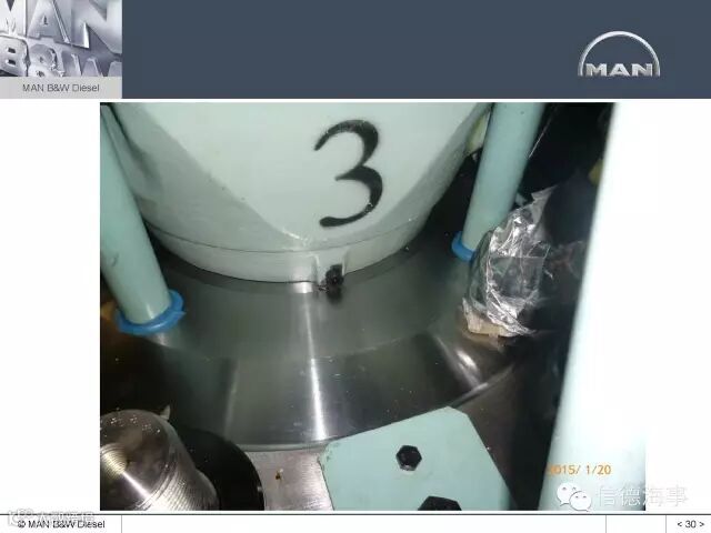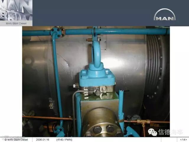 如油压表波动且其波动频率和柴油机转速一致,说明 可能至少有一个缸排气阀滑油系统有问题。判断方法:a)运行中松开排气阀回油管接头,收集回油量应少于40l/h,否则启阀活塞失密,可能是活塞环不 好或油缸磨损太大;b)排气阀高压油管由内外管所组成,如果排气阀接头处Disc外侧密封圈良好,而接头又漏油,则压 力油将通过内处管空间回流至排气阀驱动机构进油端。故运行中可松开接头处闷头(Plug)检查是否有油漏出,如有说明油管接头密封面失密;C)如果没有以上两种情况,则可能某缸驱动机构供油止回阀不好、柱塞活塞环不好或油缸磨损太大。