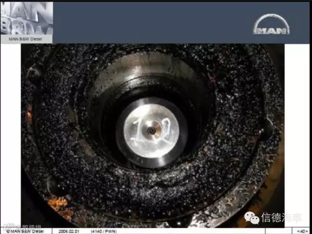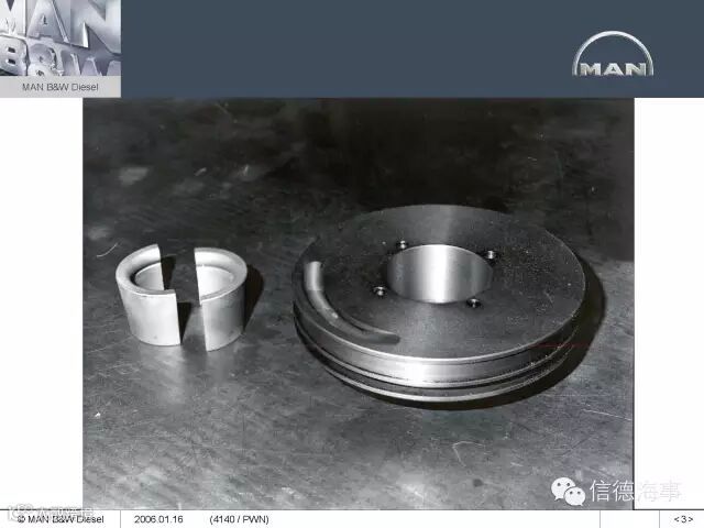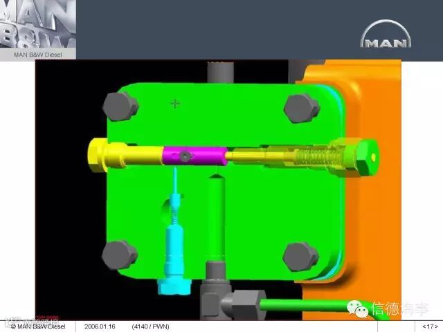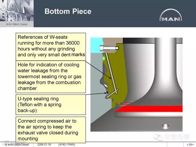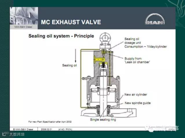 •所谓的密封单元是指为排气阀杆和阀杆导套之间提 供密封介质的单元。阀杆与导套之间密封不良时,会使得燃气上窜泄漏,阀杆及导套之间的腐蚀及磨损加剧,燃烧产物及结碳又会造成排气阀开关及旋转的动作不正常,严重的会造成排气阀及阀座烧损。早期的6S70MC机器其导套采用的是铜质材料,后来在使用过程中发现该导套极易被上窜的烟气所腐蚀,在使用8000小时左右时,导套的内壁就有许多的麻点。许多船就出现过这个问题,后来B&W改变了设计,改用铸铁导套,腐蚀得到了控制,但由此也需要考虑对上窜烟气的密封问题。