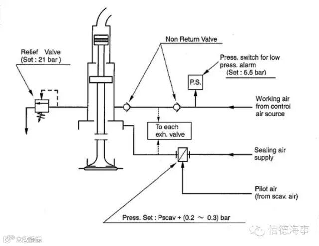 和油密封单元相比,气密封单元基本上不消耗滑油。气密封单元上有两路压缩空气被接入,一路是扫气箱的扫气压力,另一路来自主机的控制空气,只有当控制空气压力正常时,密封单元才向阀杆与导套的密封空间供气。