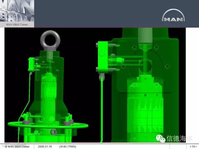 S/MC系列柴油机的启阀活塞设计为双活塞结构,两活塞之间有一弹簧,在开始关阀的时刻,上部小活塞首先和油缸的缸体接触,由于弹簧的阻尼作用,避免了关阀时的冲击和过大的噪音。早期的MC型机采用的是单活塞的启阀机构,这种机构经常出现关阀冲击声过大的现象,特别是在变速航行时这种现象更为明显,这时需要在下部的液压促动器上对回油量进行调整才能使冲击声消失。