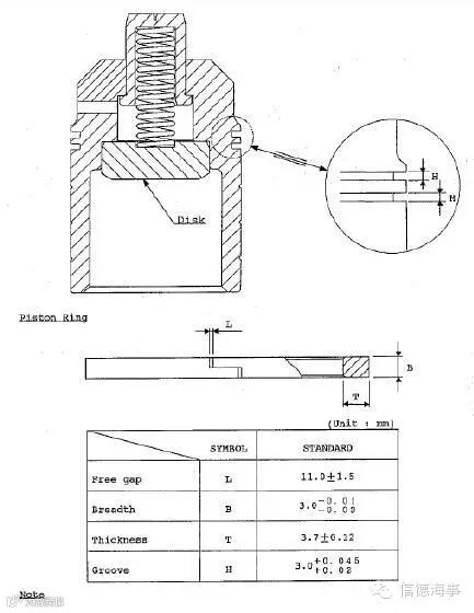 相对于单活塞启阀机构,双活塞机构在管理上要方便多了,但随着启阀机构的磨损,特别是排气阀头与阀座的磨损,双活塞机构有时也会出现关阀的敲击声。这时应按照说明书的要求,对启阀活塞的桥规值进行测量。桥规值过大,容易出现关阀的敲击声;桥规值过小,可能会造成排气阀关闭不严。对于6S70MC机,其桥规值的范围在 48.4~51.4mn之间。随着排气阀头及阀座的往复使用及研磨,使得桥规值趋向于逐渐变小;但排气阀杆与启阀活塞之间的磨损却使得桥规值趋向于逐渐变大。因此更换启阀活塞中的垫块和更换排气阀头及阀座都可以改变桥规值。