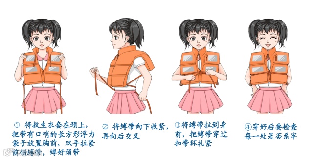 5.要将救生衣带子打死结,以免跳水时受到冲击或漂浮较长时间而松开。