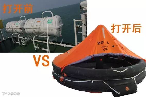 原来救生筏平时包装存放在玻璃钢筒内,安装在船舷专用筏架上,将筏直接抛入水中,救生筏既可自动充胀成形,供遇险人员乘坐;如果船舶下沉太快,来不及将筏抛入水中,当船舶沉到水下一定深度时,会自动释放。