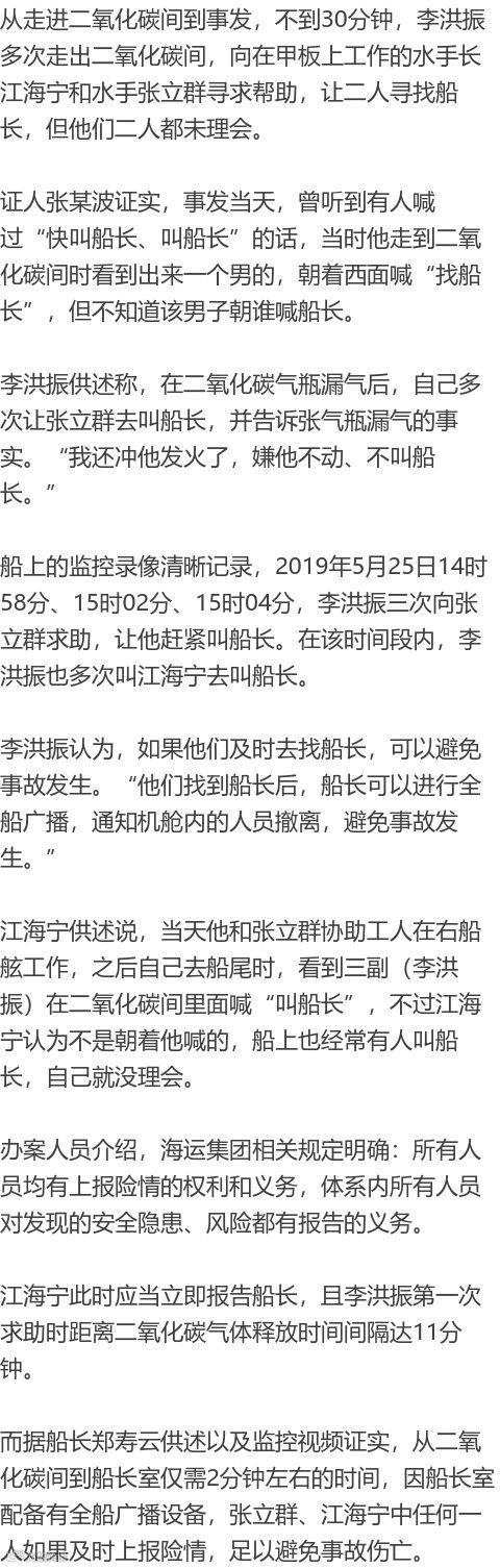 被告人李洪振(“金海翔”号货轮三副),违反福建海运集团《二氧化碳间作业安全管理规定》,单人进舱作业并误碰二氧化碳气瓶导致漏气,违反《应急救援、撤离程序》规定,没有立即通知船长和疏散机舱内人员,并在不具有操作资质的情况下拆卸驱动管路,最终导致事故发生。