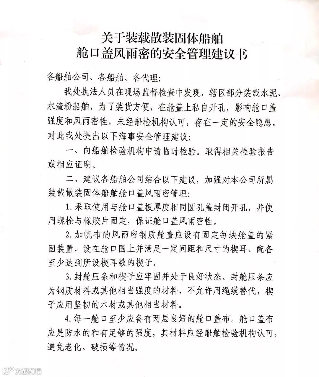 为此西港海事处高度重视,积极与相关业务处室沟通并得到技术指导,向船方发放安全管理建议书,同时开展船舶装载固体散装货物舱口盖风雨密专项检查。