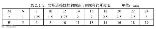 而常用连接螺栓的螺距t和螺母的厚度H也是已知的,见表2.1.3 。