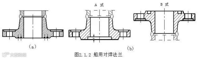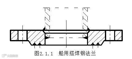 图2.1.1为船用搭焊钢法兰。这种法兰的特点是制造简单,结合可靠,但不能承受较高的压力,适用于公称压力PN≤1.6MPa(16kgf/cm²)和工作温度t≤300℃的管路。它的公称通径DN的范围为20mm~500mm。
