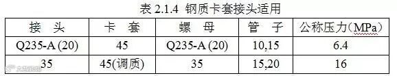 ⑵ 测量、液压传动用卡套接头 此类卡套接头主要用于仪表测量、液压传动管路。其材料及适用范围见表2.1.4。管子常用规格为Φ81mm~Φ223mm的无缝钢管。