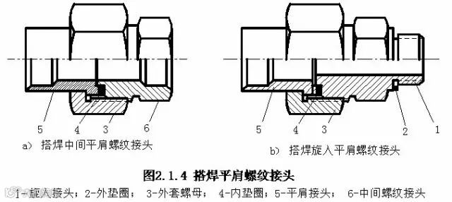 搭焊中间平肩螺纹接头如图2.1.4(a)所示。它由中间螺纹接头、垫片、平肩接头和外套螺母组成。用于管路中两段管子的连接;当支管的直径远小于总管的直径时,也可以直接焊在总管上作开支管之用。