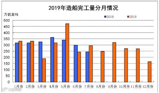 1~7月份,全国造船完工2211万载重吨,同比增长1.4%。承接新船订单1470万载重吨,同比下降38.9%。7月底,手持船舶订单8190万载重吨,同比下降8.4%,比2018年底下降8.3%。
