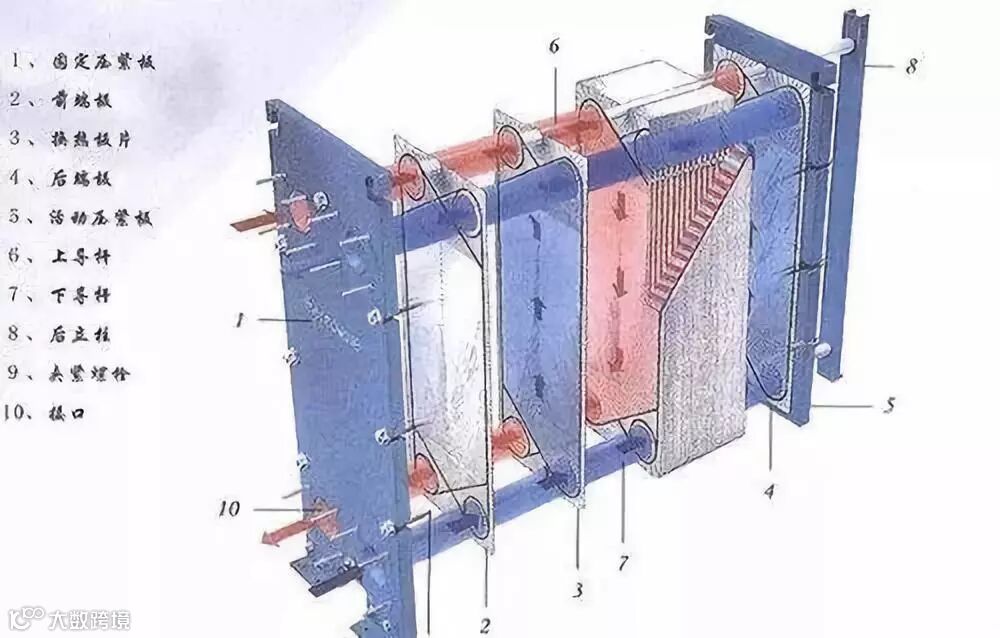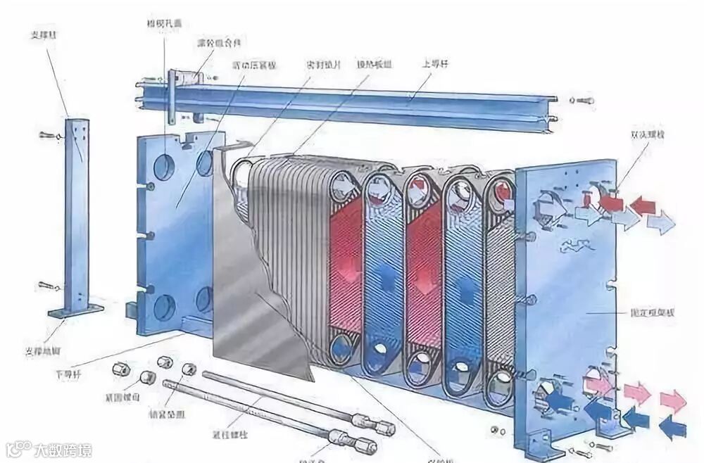 板式换热器的结构原理是结构上的组合,是指按一定间隔将可拆卸的板式换热器中的冲压有波纹薄板通过垫片密封好,并且用特有的框架和压紧螺旋重叠来压紧,而板片和垫片的四个角孔就是流体的分配和汇集管道,能合理地将冷热流体分开,通过板片进行热交换。
