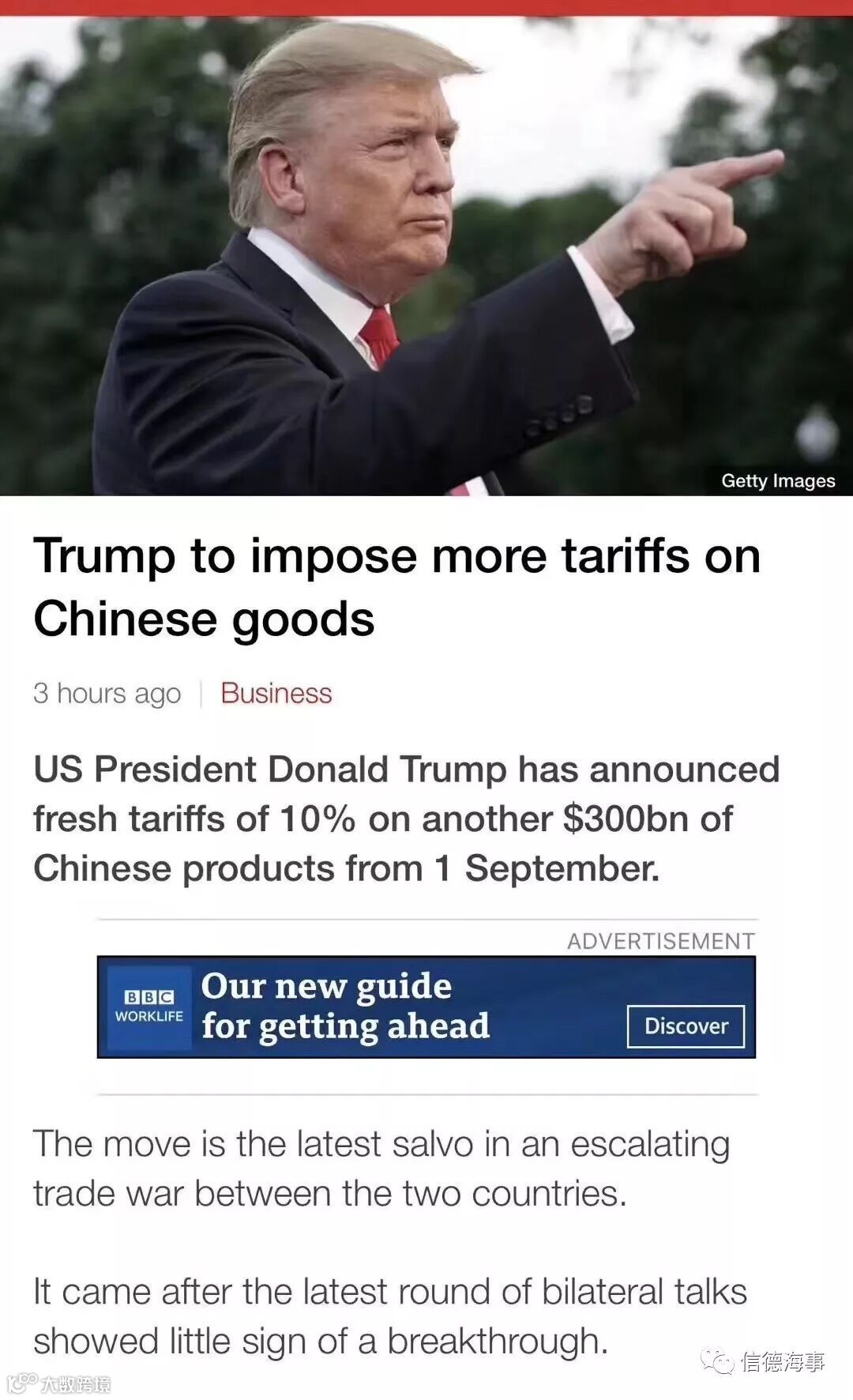 特朗普出尔反尔再次“发疯”,在社交媒体上放言将从9月1日起对中国3000亿美元商品加征10%关税。