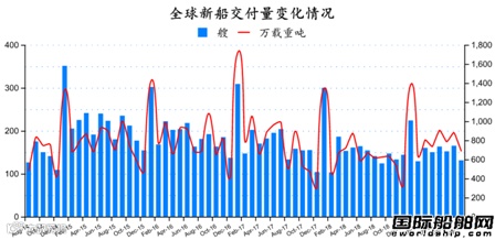克拉克森数据统计显示,2019年8月份全球船厂共交付新船131艘,共计6927109载重吨。与2019年7月份全球新船交付订单165艘,共计8857592载重吨相比较,数量环比下跌20.61%,载重吨环比下跌21.79%。与2018年8月份全球船厂共交付新船141艘,共计6166420载重吨相比较,数量同比下跌7.09%,载重吨同比上升12.34%。
