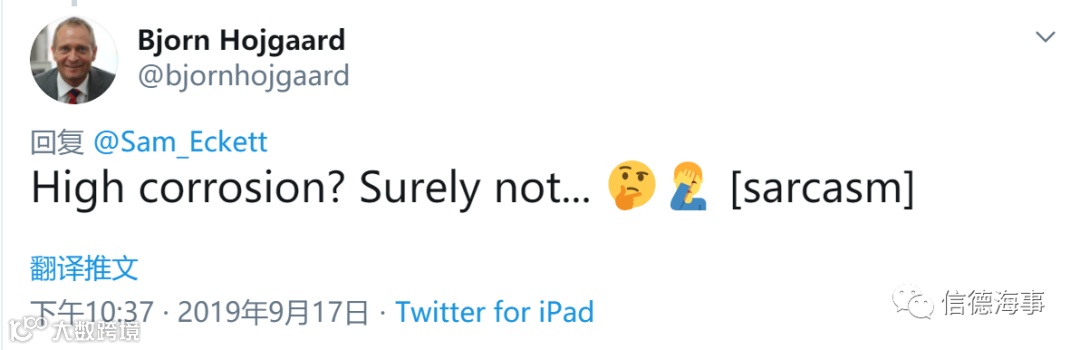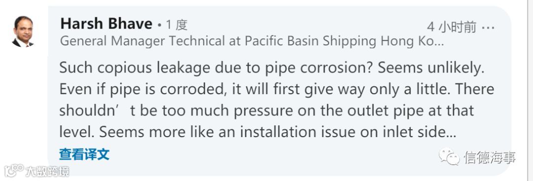 昨天普氏能源资讯S&P Global Platts副主编Sam Eckett在社交媒体上发布了一段长约51秒的视频,并介绍到,一艘超大型矿砂船VLOC安装的脱硫设备发生故障,报道称事故原因是因为设备遭遇严重腐蚀所致。