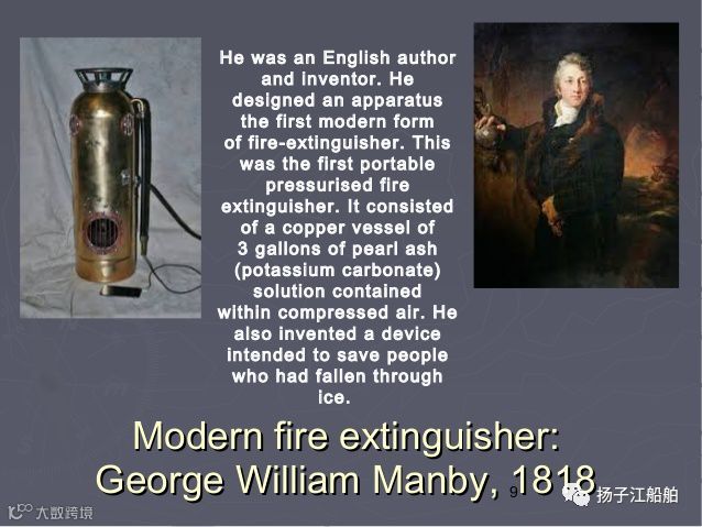 1818年,曼比船长发明了世界上第一个便携式灭火器,被认为是现代灭火器的祖先。