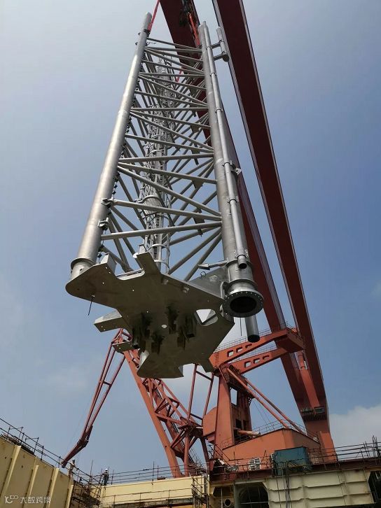 总装四部第一次负责泵塔吊装,没有现成的模式可以借鉴,之前LNG船型泵塔均在码头吊装,与22000箱船吊装阶段不同,且22000箱船泵塔吊装后需与液穹顶盖配合,安装精度要求更高,难度更大。为此,部门提前组织人员到设计所沟通吊装注意事项,并多次安排相关技术人员到总装二部进行学习,熟悉掌握泵塔吊装的技术要点,同时自制相应工装。此外,早在泵塔设计、制作阶段,总装四部就提前与GTT、东鼎沟通协调,由于GTT也是第一次设计MARK Ⅲ型液货舱泵塔,设计进行了多次修改、优化,部门时刻跟进检查泵塔的施工进度,并考虑吹扫管、电缆的提前布置、敷设,提高了泵塔完整性,也确保了泵塔顺利吊装。