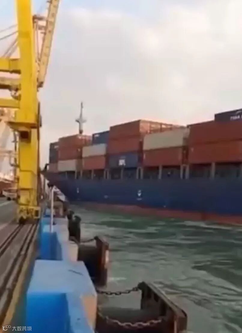 ▲集装箱船撞向码头